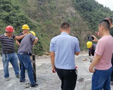 重慶創(chuàng)普達(dá)機(jī)械科技有限公司對施工現(xiàn)場進(jìn)行了勘察,制定了詳細(xì)的施工方案:一天半鉆孔25個,裝管25支,現(xiàn)場臨空面高約7米,采用3.5X3.5X4米一字排形鉆鉆孔,嚴(yán)格控制鉆孔尺寸和一字排形對應(yīng)尺寸鉆孔,最終結(jié)果測量為(裂鏠尺寸)是35米X6米X5.5米共1155方,每支管出方46.2方.